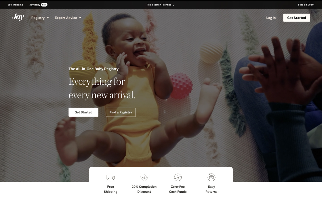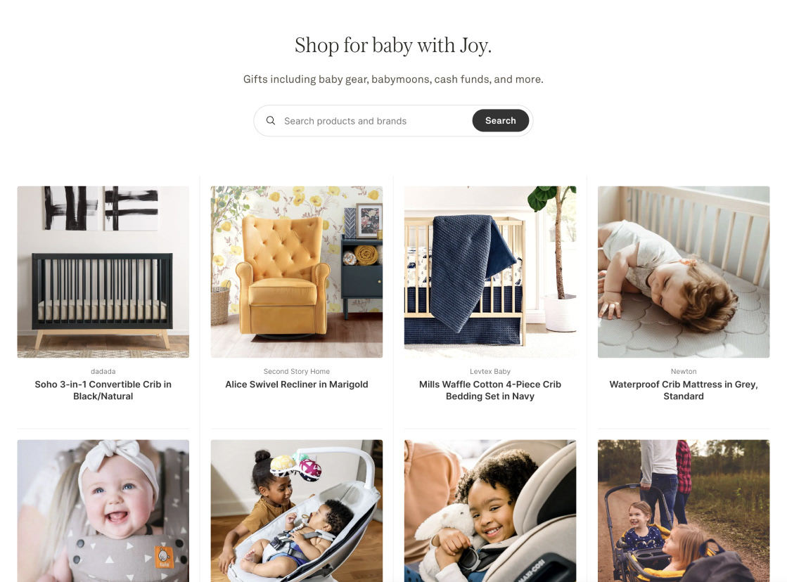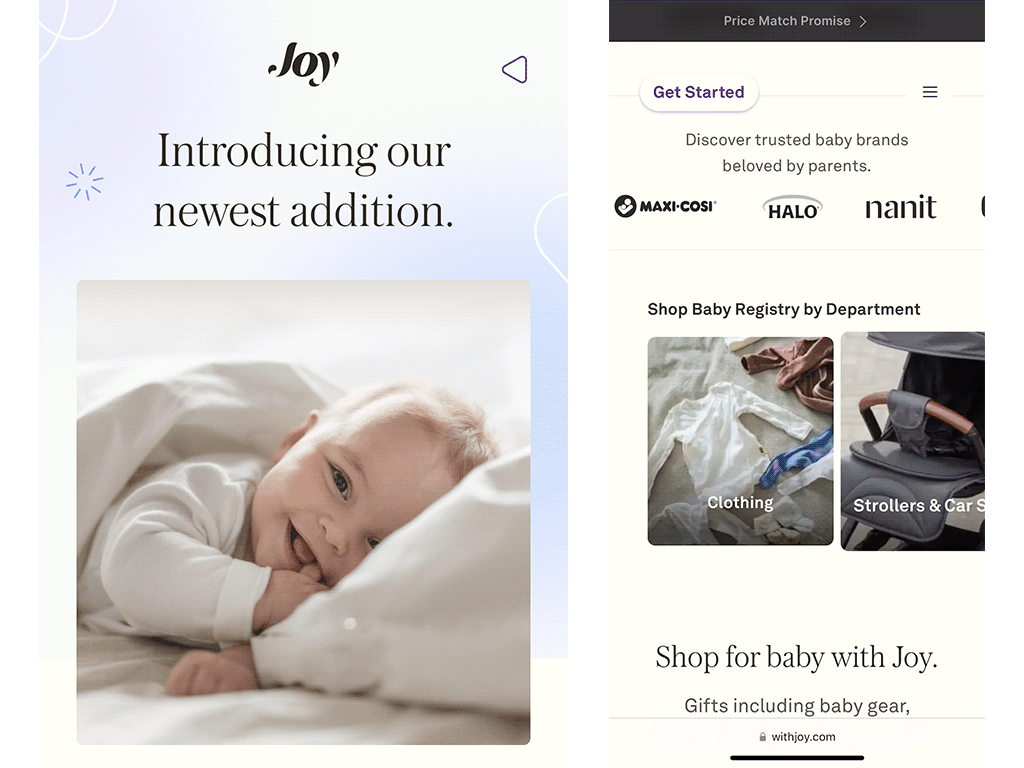 As Joy expands its offerings to more life events, the team welcomed the Joy Baby Registry (pun intended.) My role was to lead and kick off the marcom side. I quickly initiated design by leveraging the established brand language of our Wedding Registry as a foundation. The team and I seamlessly integrated baby imagery and colors into the existing framework to create a cohesive and visually exciting experience for our old and new users.