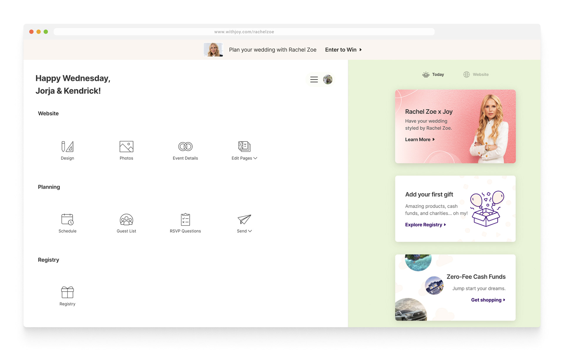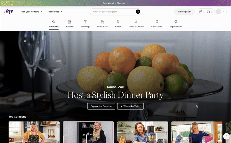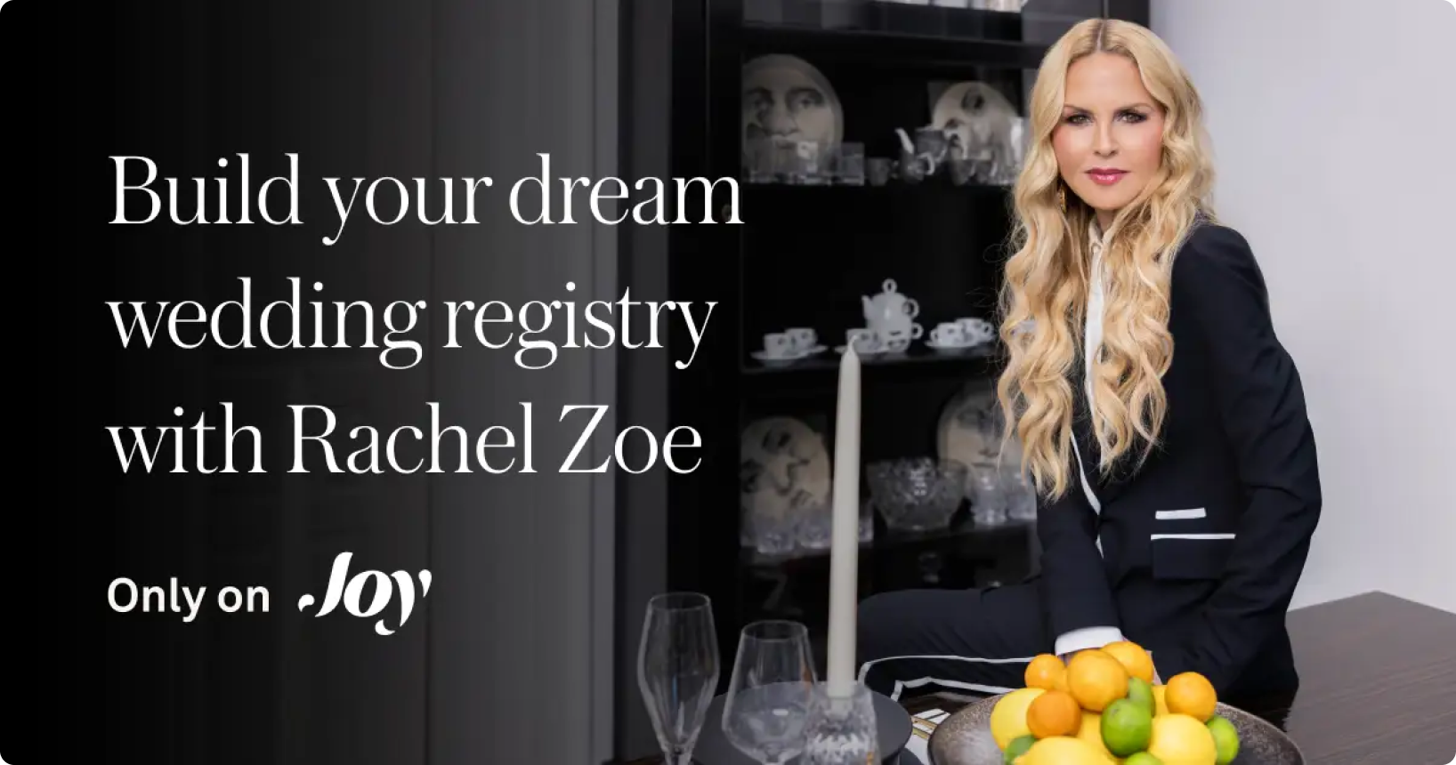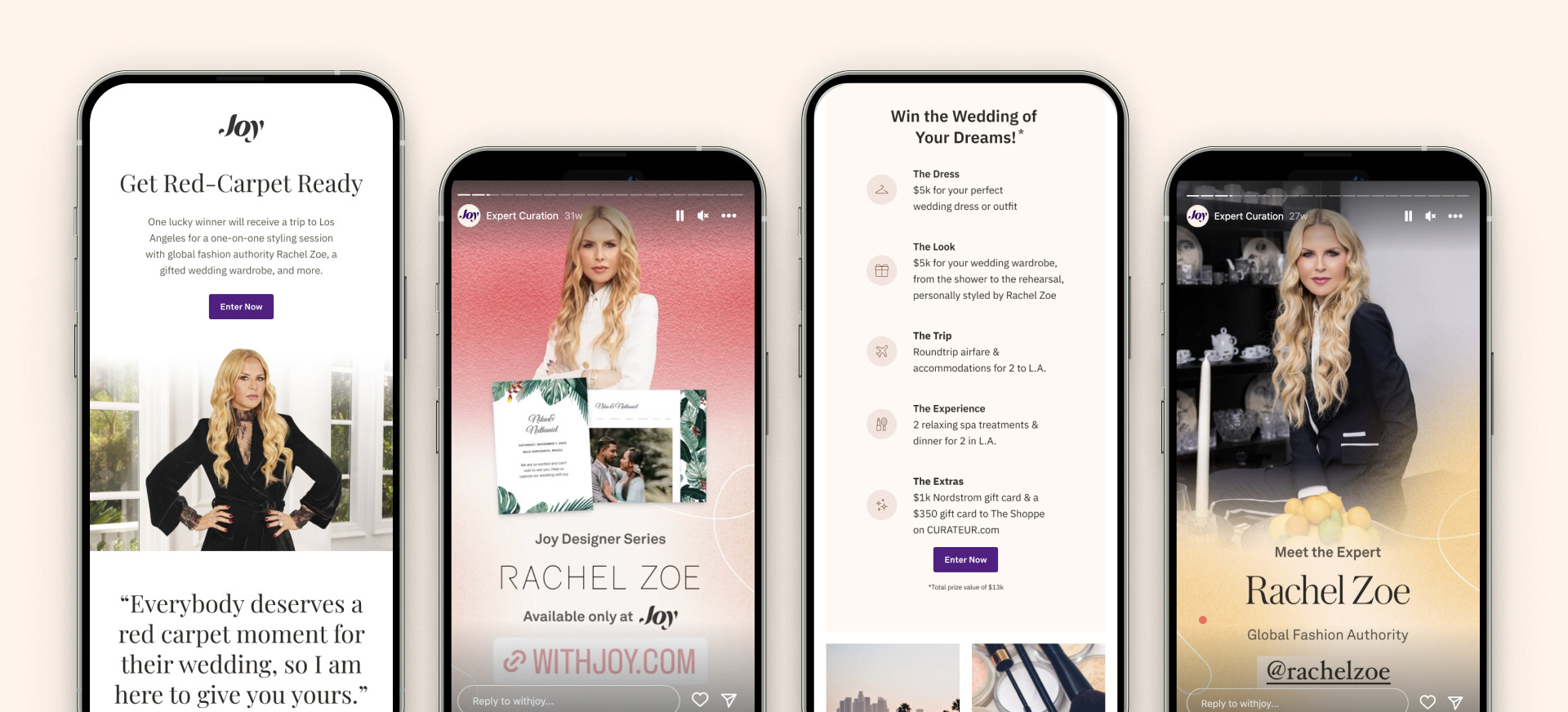 I was a part of leading design for Joy x Rachel Zoe campaign. This partnership served as a kickoff for Joy's new Registry Expert Curations. This collaboration first launched with a giveaway that once over, would continue on with Rachel's Registry picks and unique RZ website and card designs for all Joy users. This campaign consisted of a landing page, emails, in-product banners, social, and more.